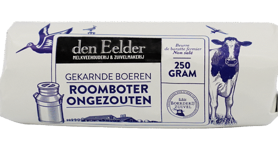 Den Eelder Roomboter is gemaakt van dagverse gepasteuriseerde volle koemelk, zonder toevoegingen en een flinke dosis liefde. Het is verkrijgbaar in een plastic kuipje van 180 gram en in een rolletje van 250 gram en 500 gram, verpakt in boterpapier.